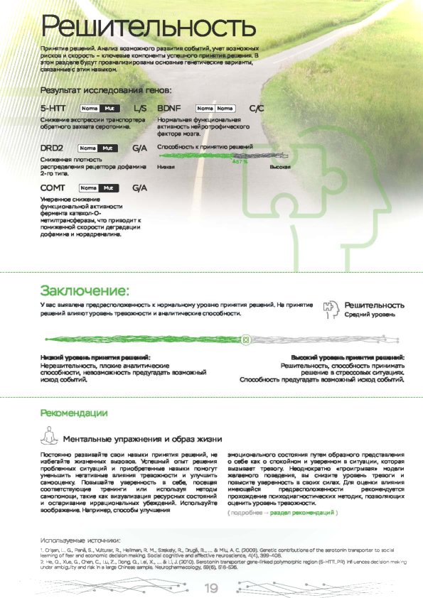 Этот ДНК анализ показывает влияние наиболее важных 10 генов на психическое и эмоциональное состояние. Именно они регулируют выработку гормонов, работу нейромедиаторов. Используйте знания о природных свойствах своего организма для борьбы со стрессом, повышения работоспособности и общего тонуса. Каждый человек индивидуален, поэтому мы рекомендуем пройти наш генетический нейро тест в Камызяке.